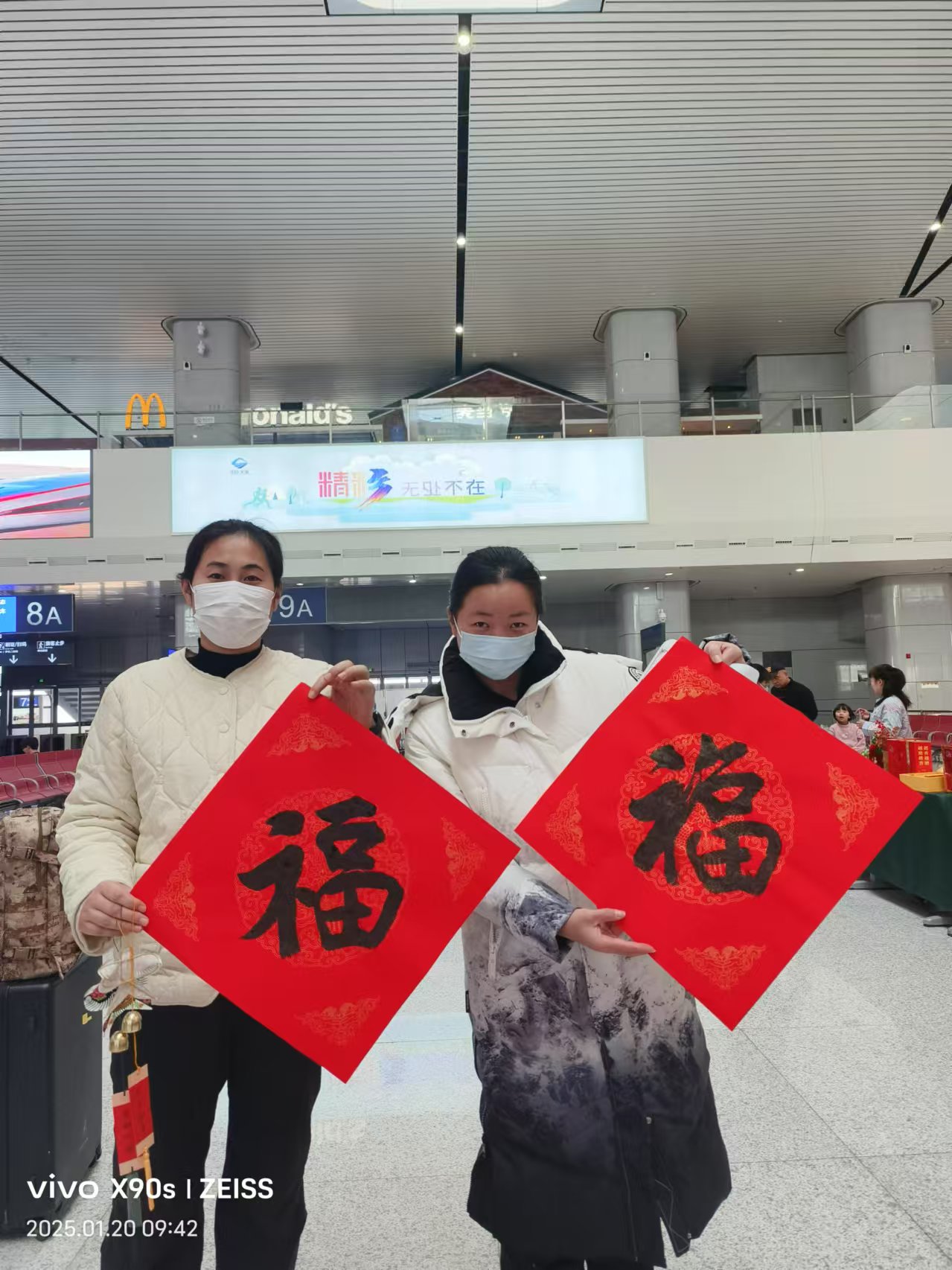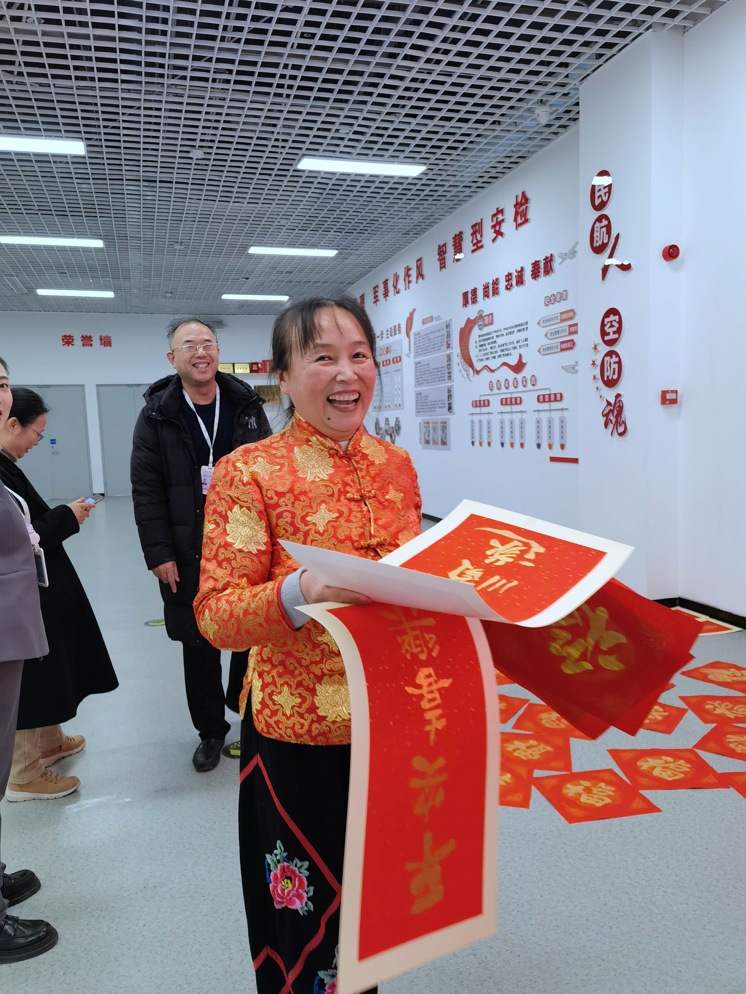 许多旅客不时与书家们互动,他们脸上洋溢着喜悦的神情,有的旅客提出自己喜欢的字体“福”字,书家们便欣然应允,当场书写。看着自己心仪的“福”字,旅客们眼中闪烁着喜悦的光芒,纷纷竖起大拇指,对书家们赞不绝口。