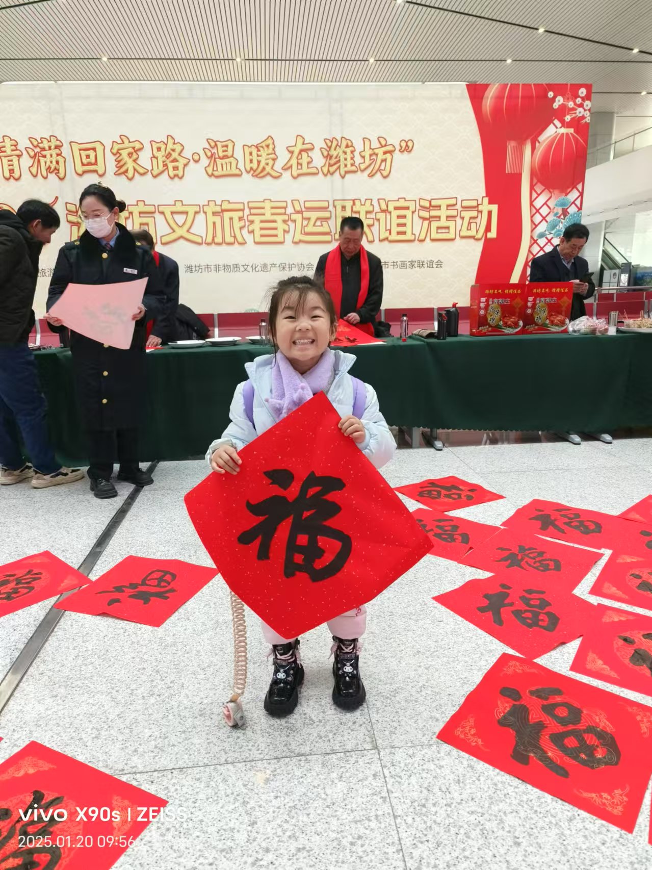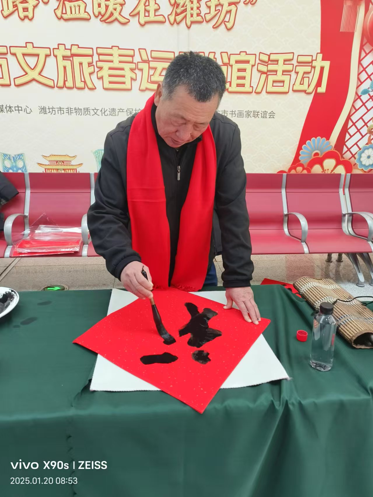 此次“情满回家路 温暖在潍坊” 2025潍坊文旅春运联谊送祝福活动,据悉,先后书写了700多个大“福”字,不仅为旅客们送上了浓浓的新春祝福,也让书法艺术在这个特殊的时刻得到了充分的展现,成为了潍坊这座城市春运期间一道亮丽的风景线。