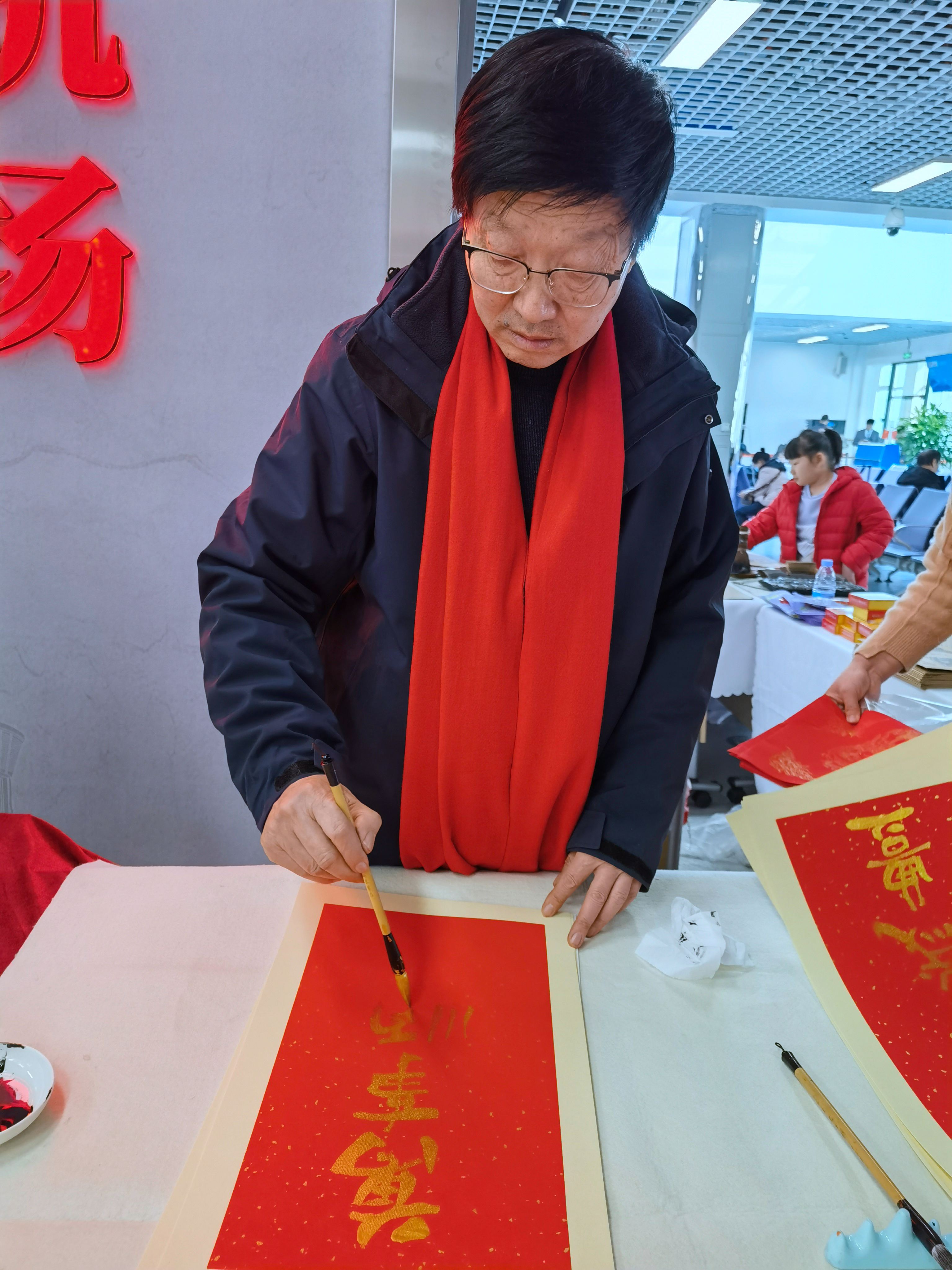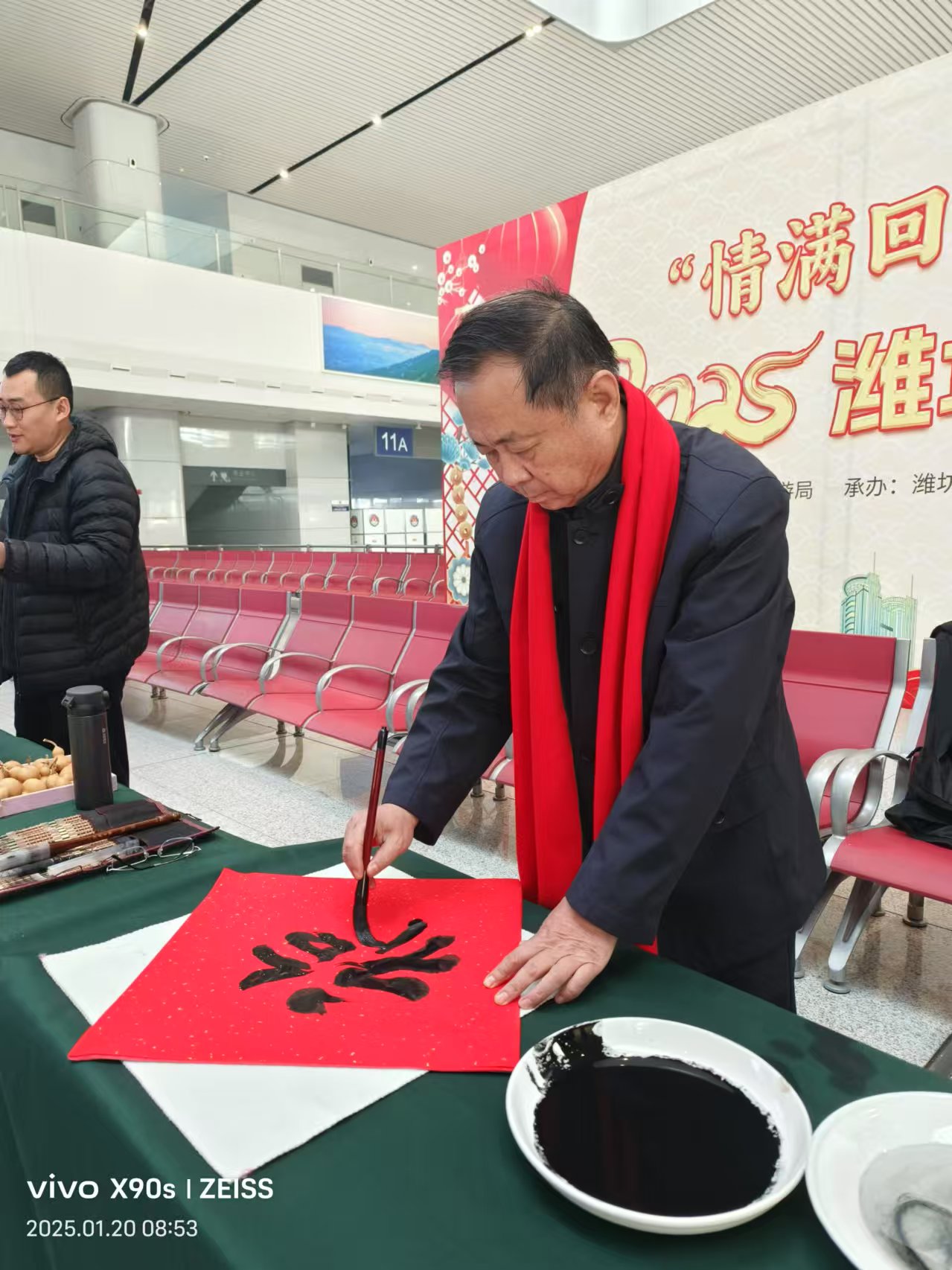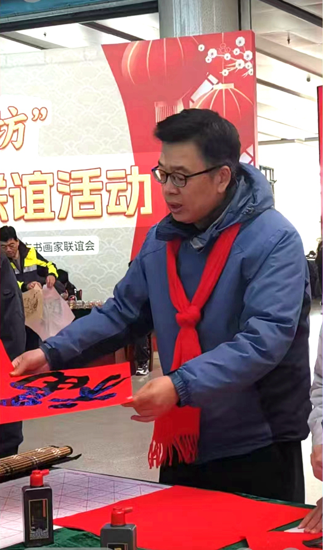 潍坊市书画家联谊会的书家们,与潍坊市非遗协会的非遗传承人一起,纷纷行动。联谊会主席孙学科,与副主席衣军,秘书长刘恩泰、理事柴爱国、副秘书长丁建民、王曙光等一众积极参与。活动现场,书家们精神抖擞,挥毫泼墨,用真草行隶篆诸体,尽情展现书法的魅力。一个个大红“福”字跃然纸上,那饱满的笔锋,流畅的线条,仿佛在对旅客们的深情祝福。这些“福”字,如同冬天的火焰,温暖了旅客们回家的路。