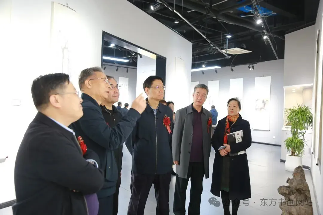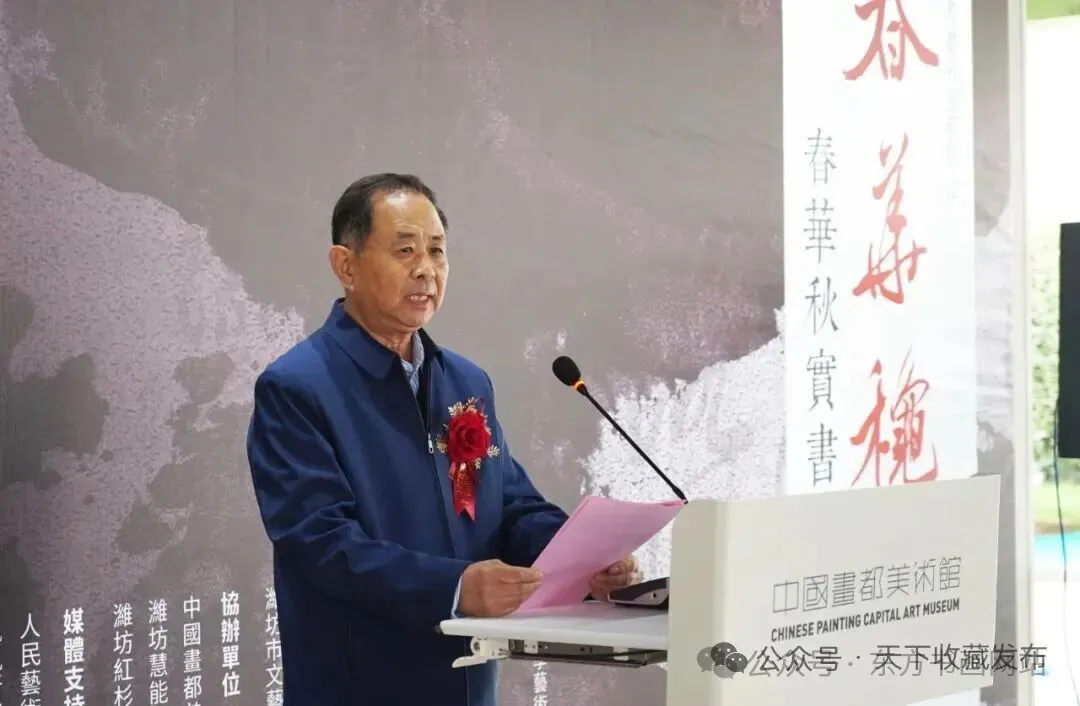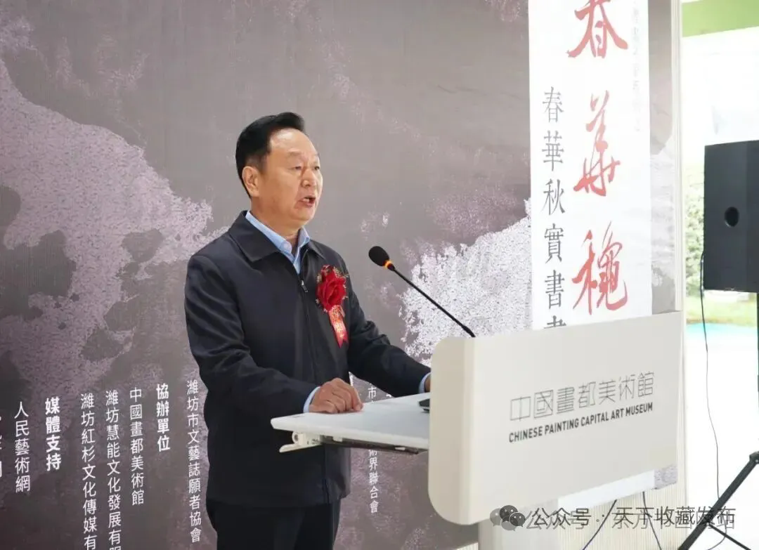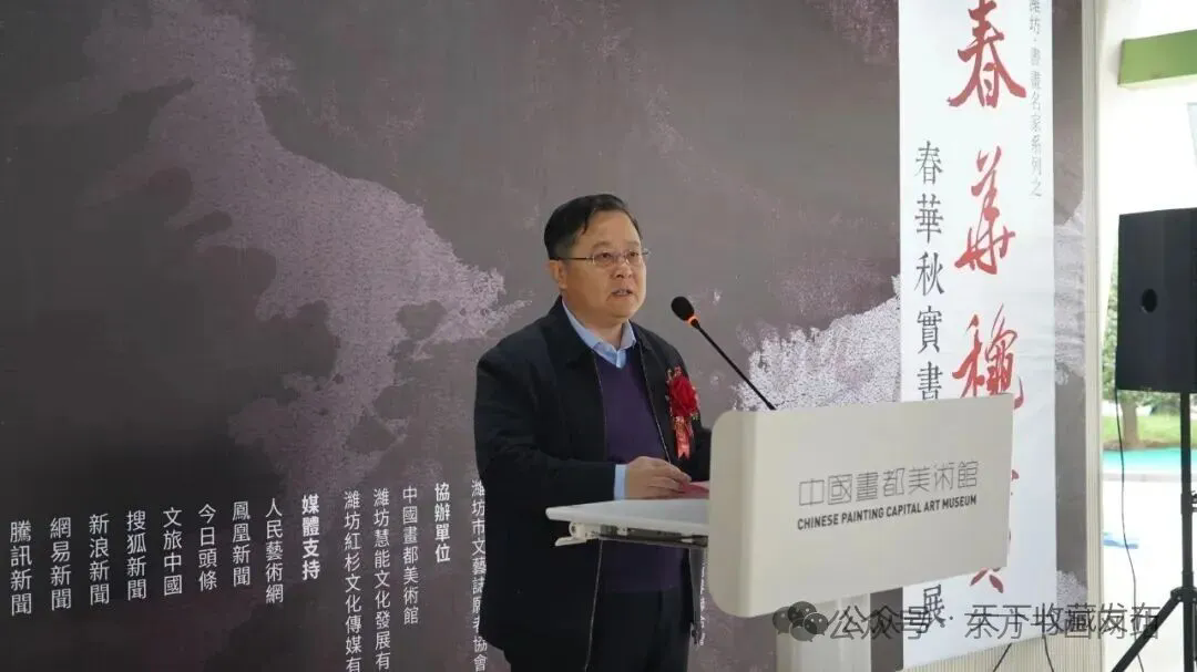 潍坊市文学艺术界联合会党组成员、二级调研员冷文清,潍坊市美术馆馆长李国祥,潍坊市技师学院原党委副书记、院长丁汉邦先后分别致辞;潍坊市书画家联谊会主席孙学科主持并介绍了书画精品展展览情况;潍坊市政协原党组成员、副主席刘树亮宣布“更好潍坊·春华秋实”书画精品展开幕。潍坊市文学艺术界联合会党组成员、⼆级调研员冷文清致辞潍坊市书画家联谊会主席孙学科主持开幕式并介绍展览情况 出席此次开幕式的领导嘉宾有:市政协原党组成员、副主席刘树亮,市技师学院原党委副书记、院长丁汉邦,市政协原常委、经济委副主任、市应急局原二级巡视员王云华,市政协原常委、经济委副主任、市国资委原二级巡视员张长坤,奎文区人大原党组书记、主任、原二级巡视员冯天韬,市人大原常委、社会建设委副主任、市总工会常务副主席郭召义,市统计局原党组书记、局长侯方武,市技师学院原党委副书记、副院长韦民,市财政局原副局长、一级调研员马进礼,市税务局原副局长、一级调研员沈彦,市文学艺术界联合会党组成员、二级调研员冷⽂清,市美术馆馆长李国祥,省美术家协会理事、市美术家协会副主席段孝敏,市文艺志愿者协会主席曹红军,市文联主席团委员、市文艺两新发展促进会会长郭宝义,市无人机航拍协会副会长李红军,市书画家联谊会主席孙学科,市书协副秘书长、市书画家联谊会副主席张景耀,市书画家联谊会副主席刘晓平、岳介中、衣军、姚志民、毕德瑞、徐中立、解荣德、韩介国,秘书长刘恩泰,以及书画爱好者、社会各界朋友近200人,共同见证了这一文化盛事。 此次展览展出了14位潍籍书画艺术家的近百幅书画精品。一幅幅精美的书画作品或笔力苍劲,或墨韵灵动,或色彩斑斓,生动展现了潍坊深厚的文化底蕴和独特的艺术魅力。艺术家们以精湛的技艺,通过书画形式描绘潍坊的自然风光、人文风貌,抒发对家乡的热爱之情,为观者带来一场视觉与心灵的文化盛宴。 笔墨追随时代,艺术服务人民。此次书画精品展的举行,不仅展示了潍坊书画艺术的丰硕成果,为书画爱好者提供了交流学习的平台,也为传承和弘扬优秀传统文化注入了活力。 相信通过这次展览,对潍坊的书画事业必将起到积极的促进作用,“更好潍坊”的美好愿景也将在艺术的滋养下越来越好。